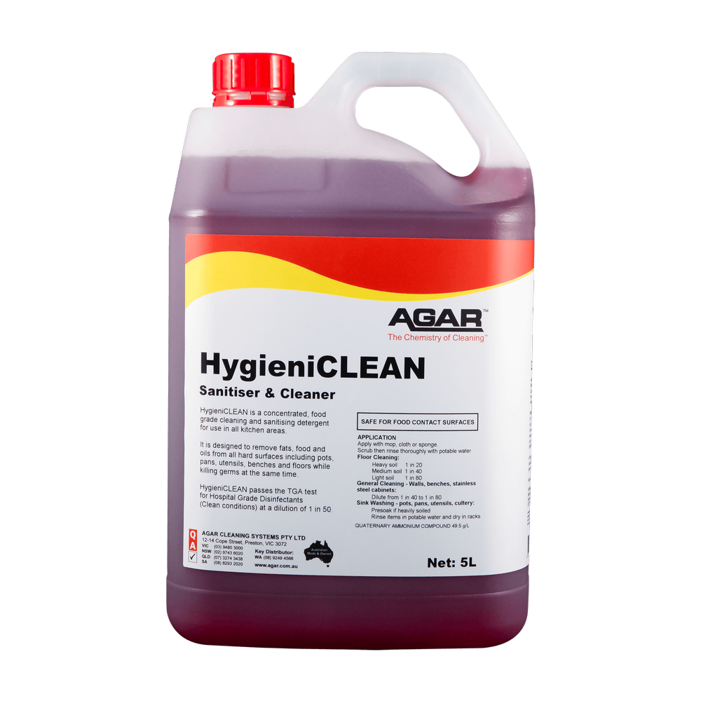 HygieniCLEAN is a concentrated food-grade cleaner and sanitiser for use in kitchens and food processing areas. It is an excellent cleaner and degreaser for general surface cleaning, sink washing of pots and pans, floor cleaning and for cleaning equipment such as filling machines, cookers, tables, cutting implements, conveyor belts and mixing pans. When washed with HygieniCLEAN, these items are rendered clean and free from most common bacteria.